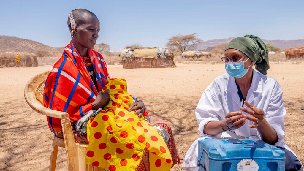 On 23 September 2022 Mary (right), a nurse in Marsabit County, advices a mother on the importance of routine vaccination at a mobile health clinic in Ntiliya village.